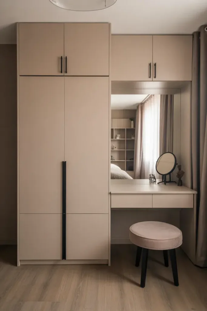 Combining a wardrobe with a dressing table saves space.