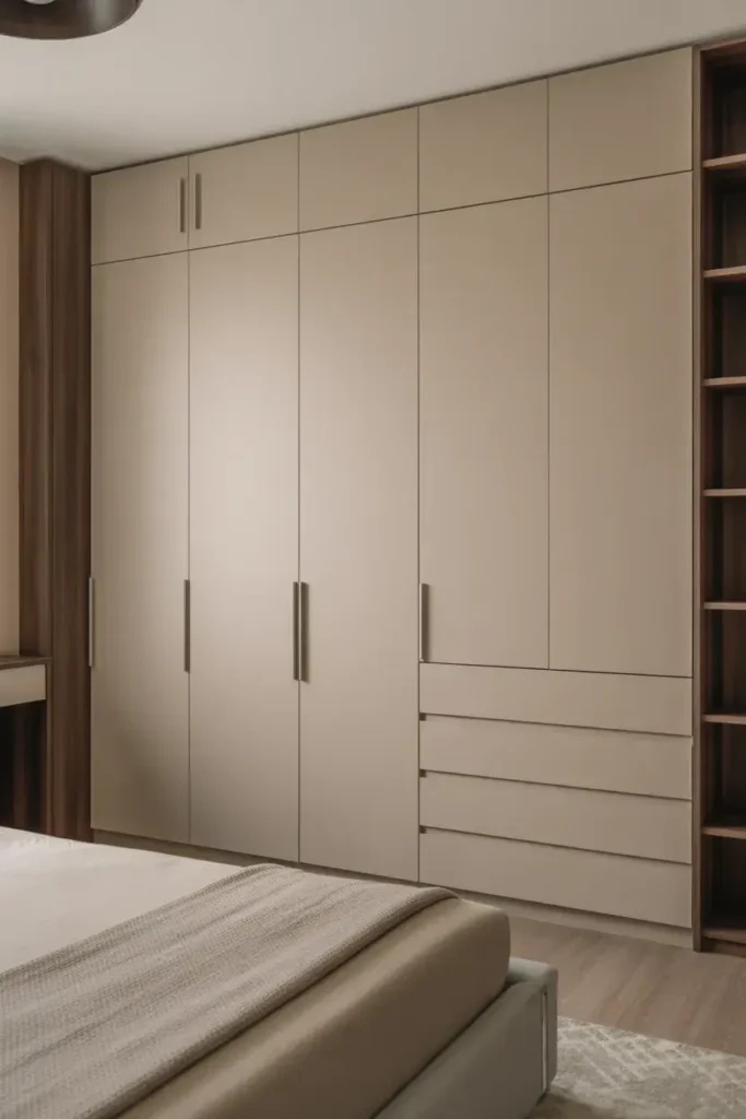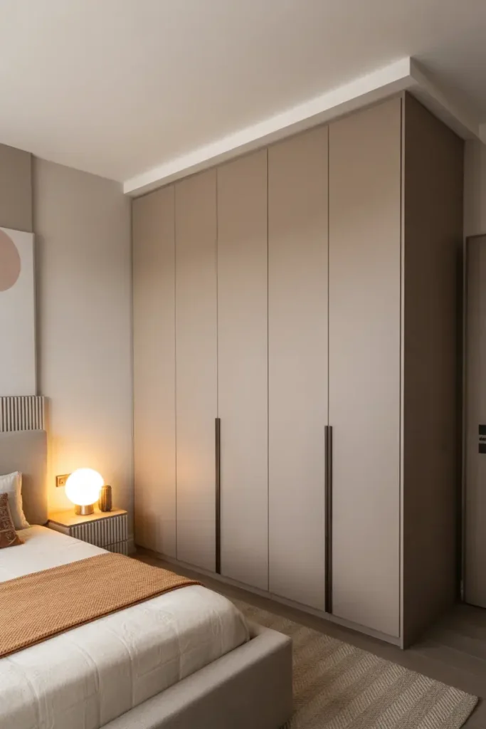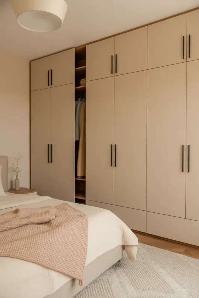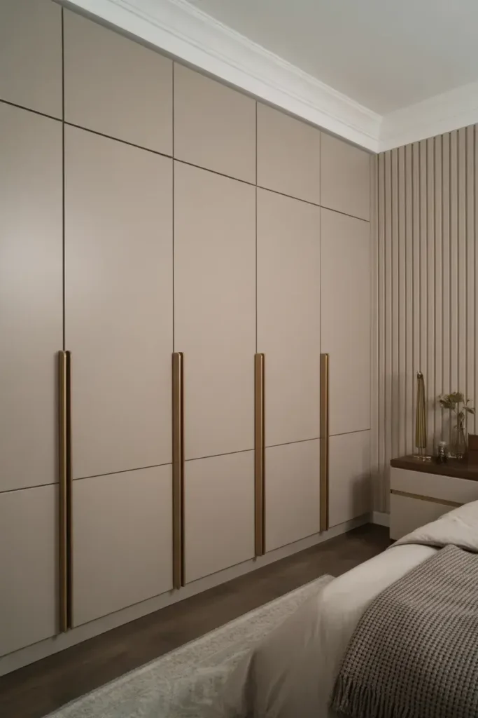 Minimal hardware keeps wardrobes looking modern. Choose slim handles or concealed pulls.