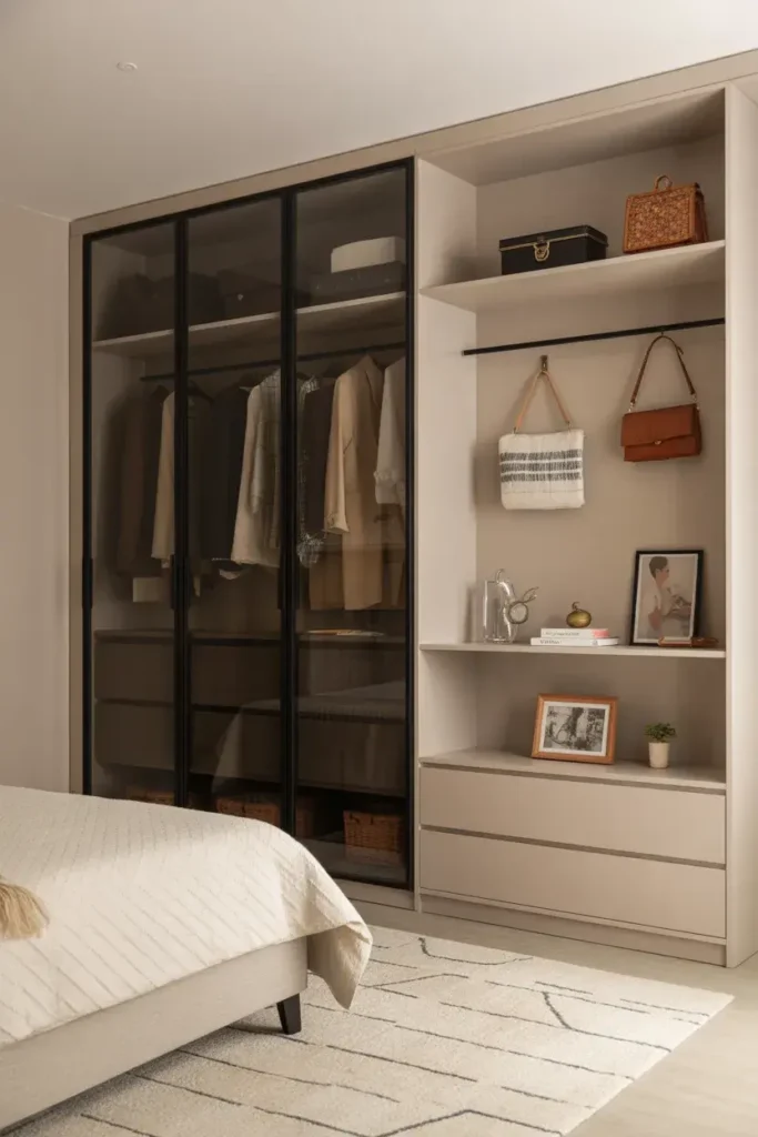 This design detail is becoming very popular in modern wardrobe design bedroom layouts because it blends practicality with style.