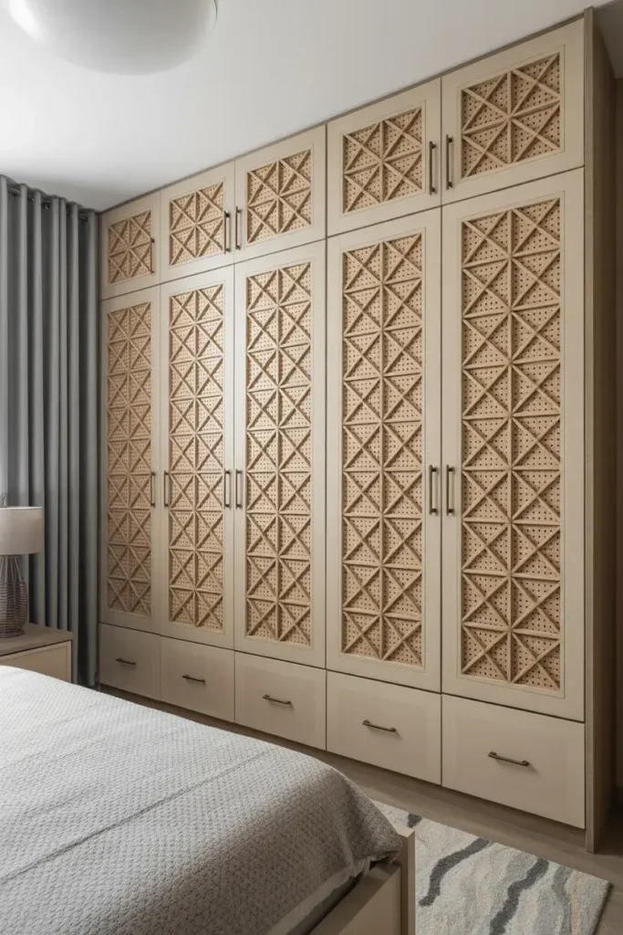 Patterned wardrobe doors add personality. Geometric patterns or textured panels can transform the look.