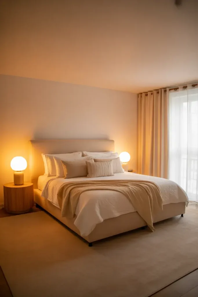 5. Cream Bedroom With Warm Lighting