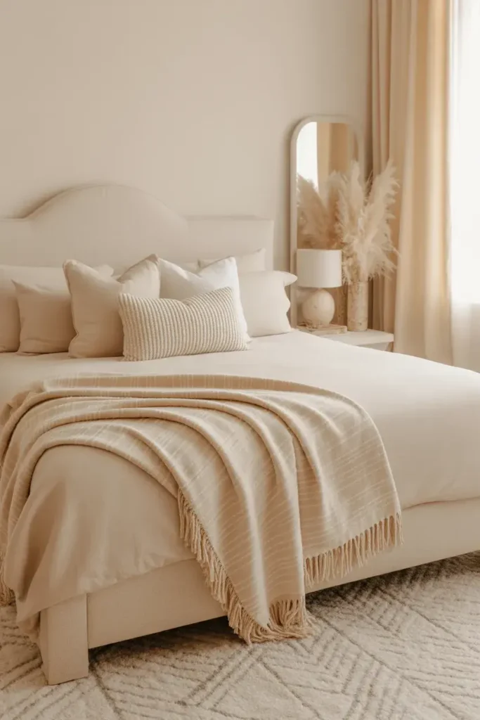 7. Cream Bedroom With Layered Throw Blankets