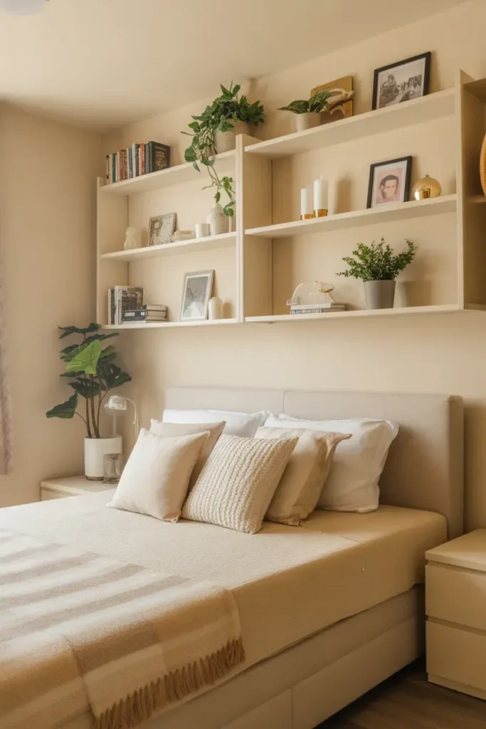 9. Cream Bedroom With Floating Shelves
