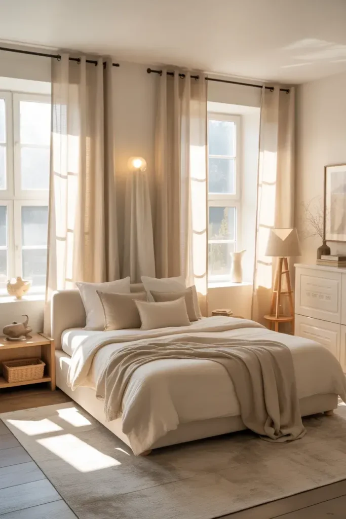 10. Cream Bedroom With Soft Curtains