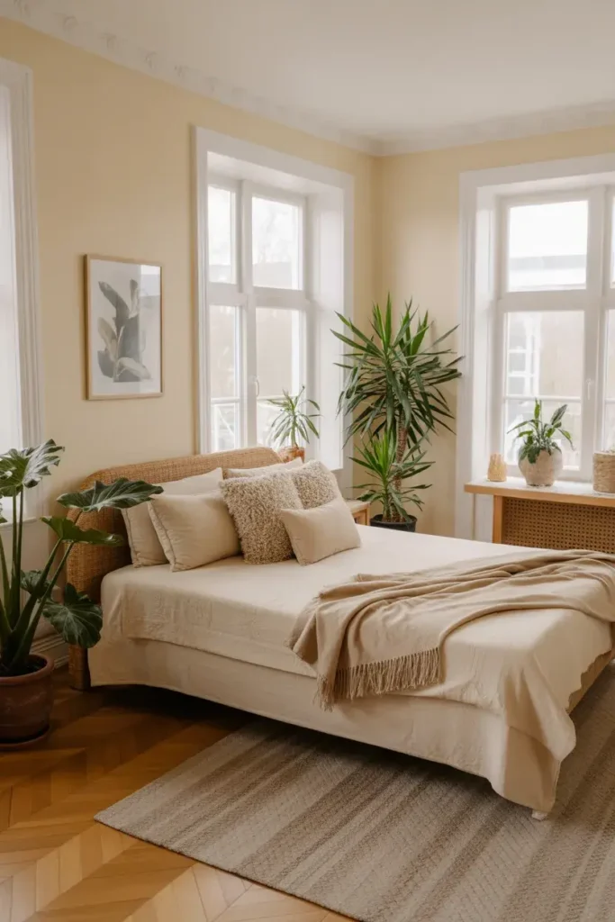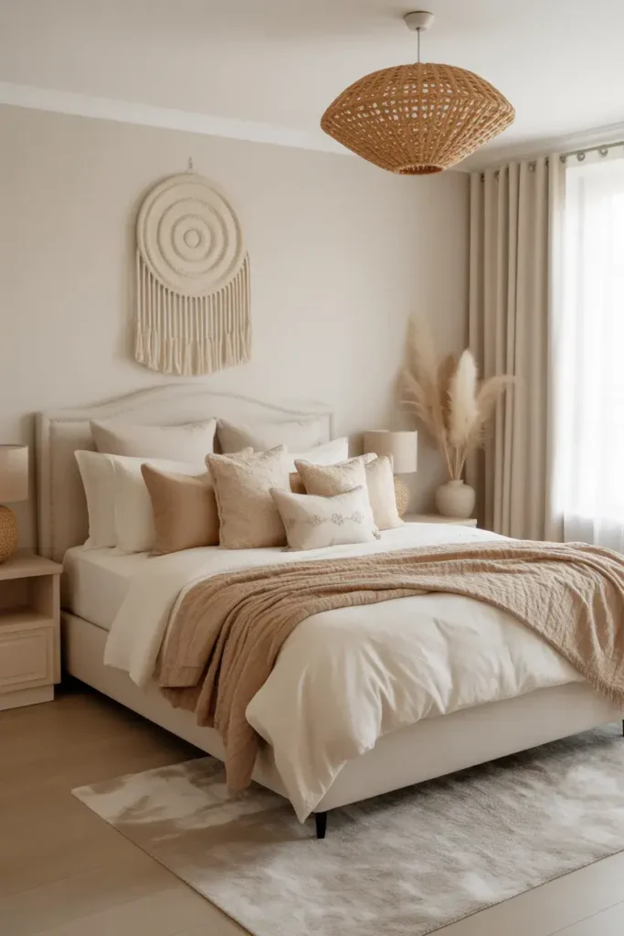 15. Cream Bedroom With Woven Decor