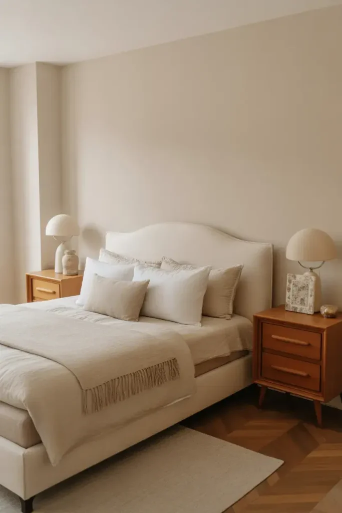 Wood nightstands add warmth to cream bedrooms. They balance soft fabrics with natural textures.