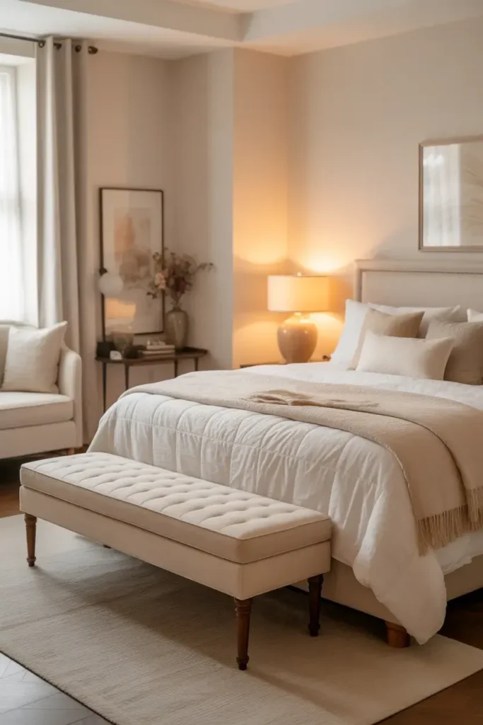 A bench at the end of the bed adds comfort and style. Choose upholstered benches in neutral tones.