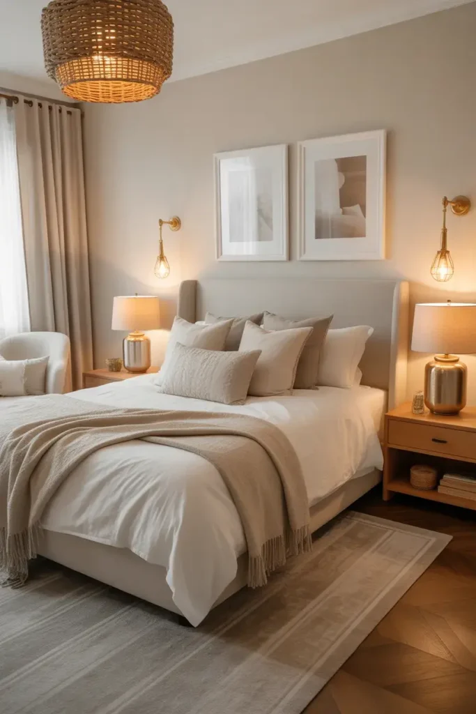 28. Cream Bedroom With Cozy Lighting Layers