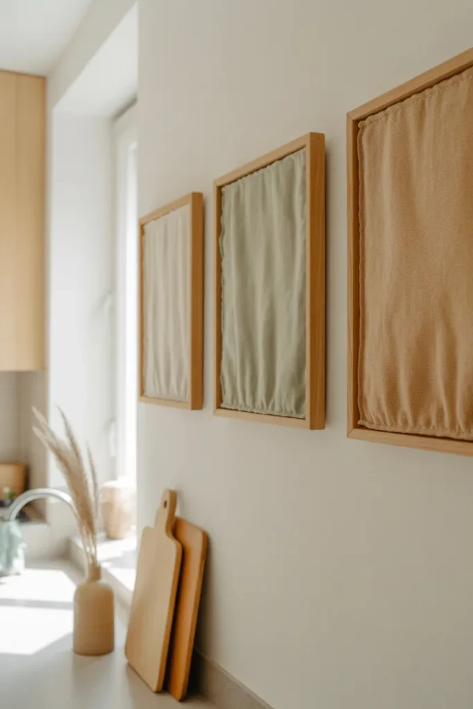 Fabric isn’t just for cushions. Stretch a piece of linen or patterned cloth inside a wooden frame and suddenly your wall feels softer.