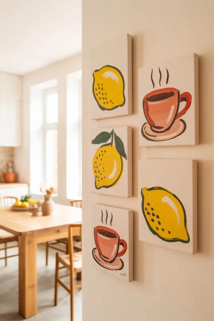 Why not paint your own art? Simple illustrations of lemons, pasta shapes, or coffee cups can feel charming and a little imperfect in the best way.