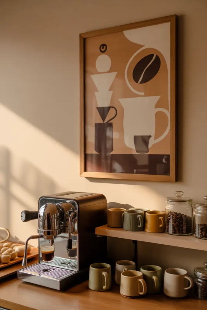If your mornings revolve around coffee, lean into it. A simple quote in handwritten style, maybe paired with a small illustration, can define a cozy corner.