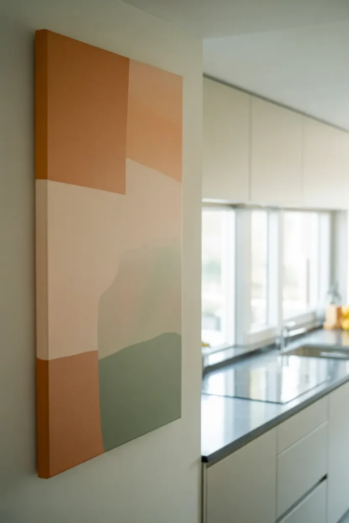 Paint simple color blocks on canvas using muted tones. Think terracotta, sage, cream.