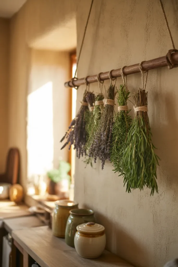 Bundles of dried herbs hanging from a wooden rod. It’s simple, but the texture and movement make it feel alive.