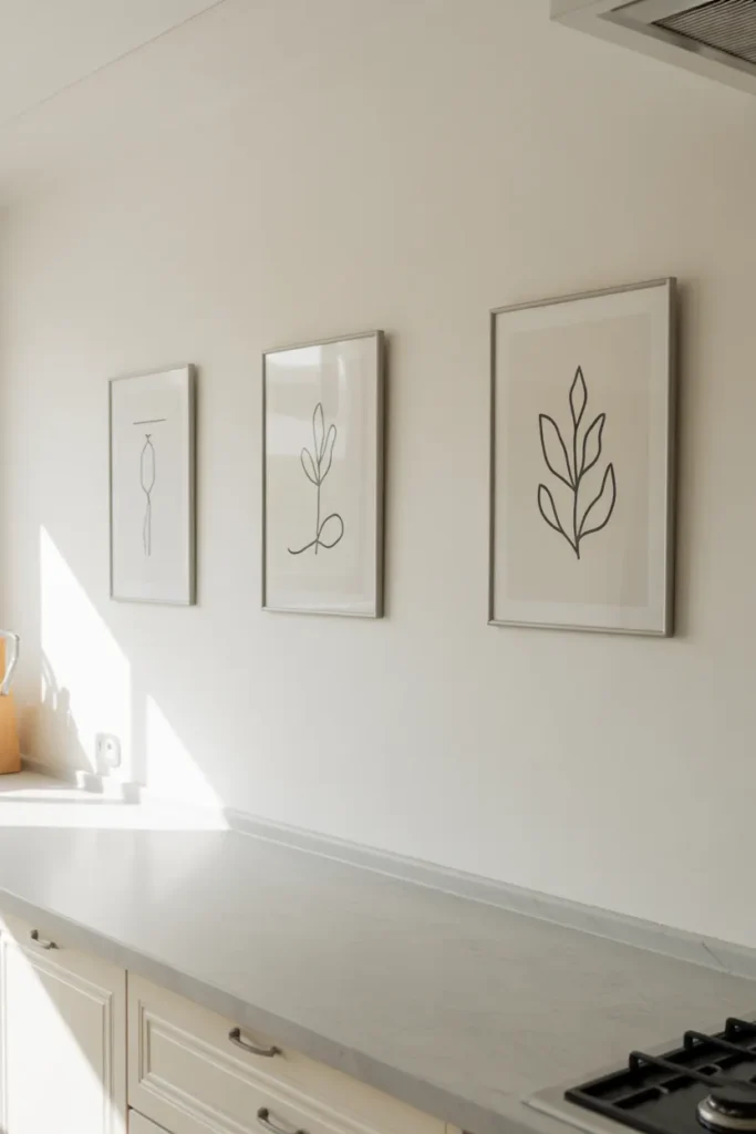 Place two or three prints above open shelves or along a narrow wall. Keep frames thin and black for that polished finish.