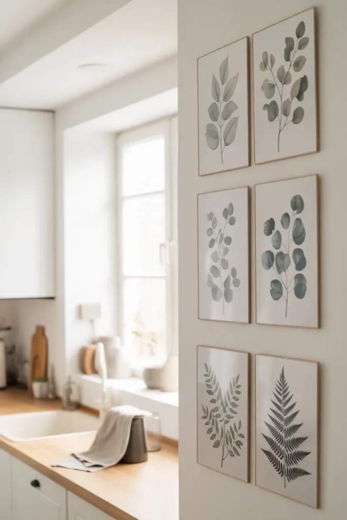 Arrange a set of botanical prints in a vertical line on a narrow wall.