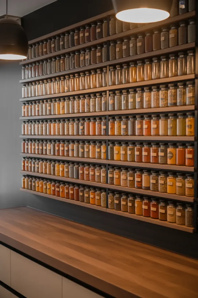Spices lined in uniform jars on a wall rack can look surprisingly aesthetic.