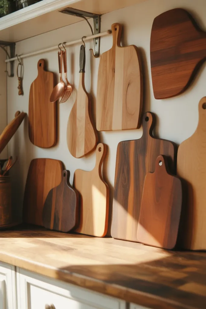 Instead of hiding your cutting boards in cabinets, imagine them layered on your wall like art. Different shapes, tones, and grains create a natural texture that instantly warms up the space.