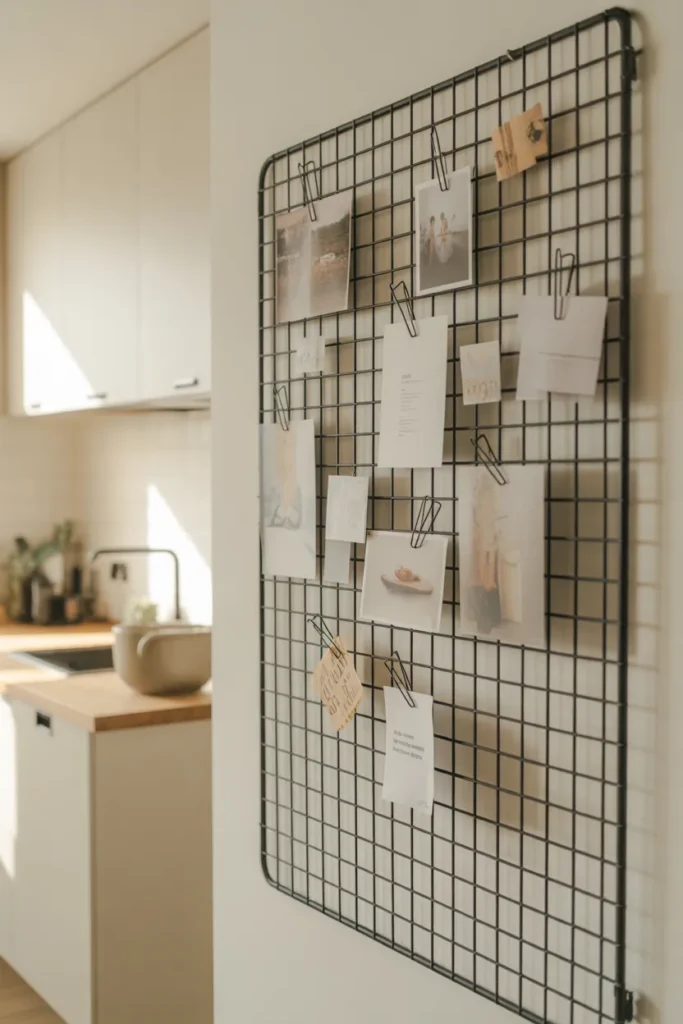 A metal grid with clips lets you switch out prints, photos, or notes whenever you want.