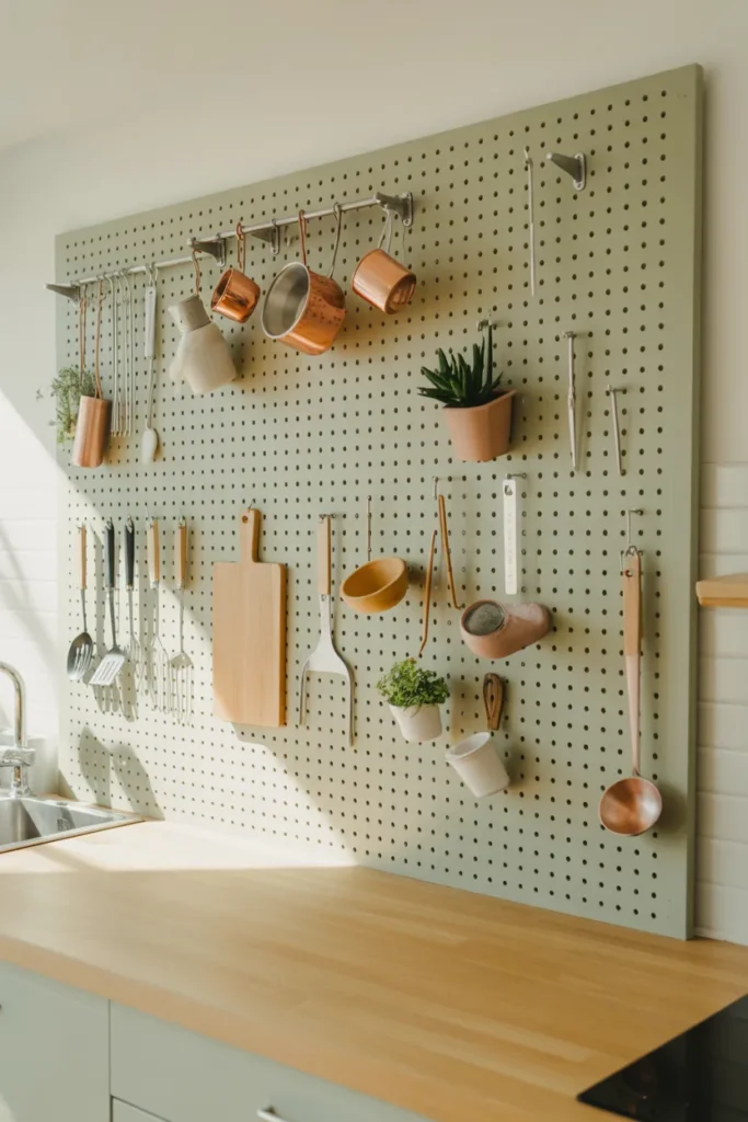 Picture a soft neutral pegboard with hanging utensils, small plants, and maybe a framed print tucked in. It’s layered, functional, and surprisingly aesthetic.