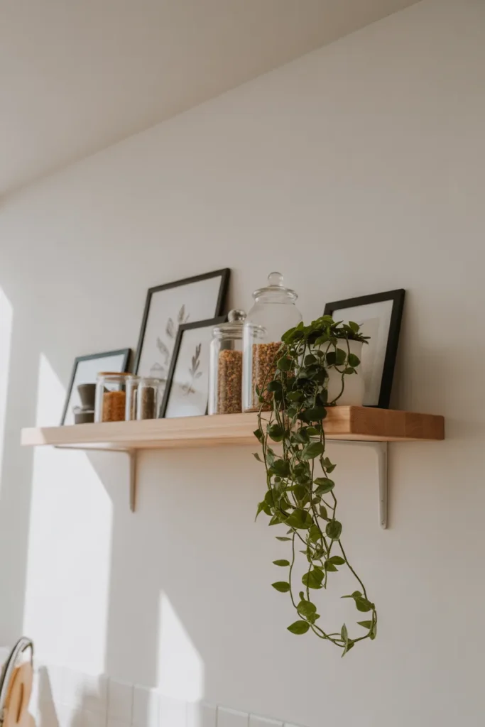 This one’s more about arrangement than the items themselves. A single floating shelf styled with small frames, jars, and plants becomes a mini art installation.