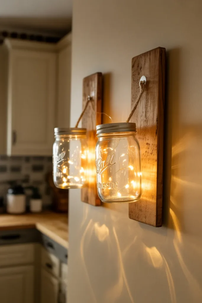 Glass jars mounted on wood panels with soft fairy lights inside. It glows in the evening and adds warmth you didn’t know you needed.