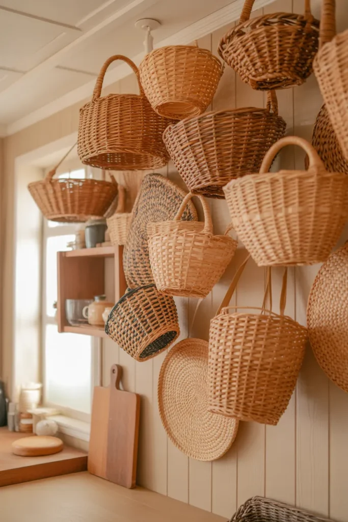 Flat woven baskets arranged on a wall create depth without heaviness.