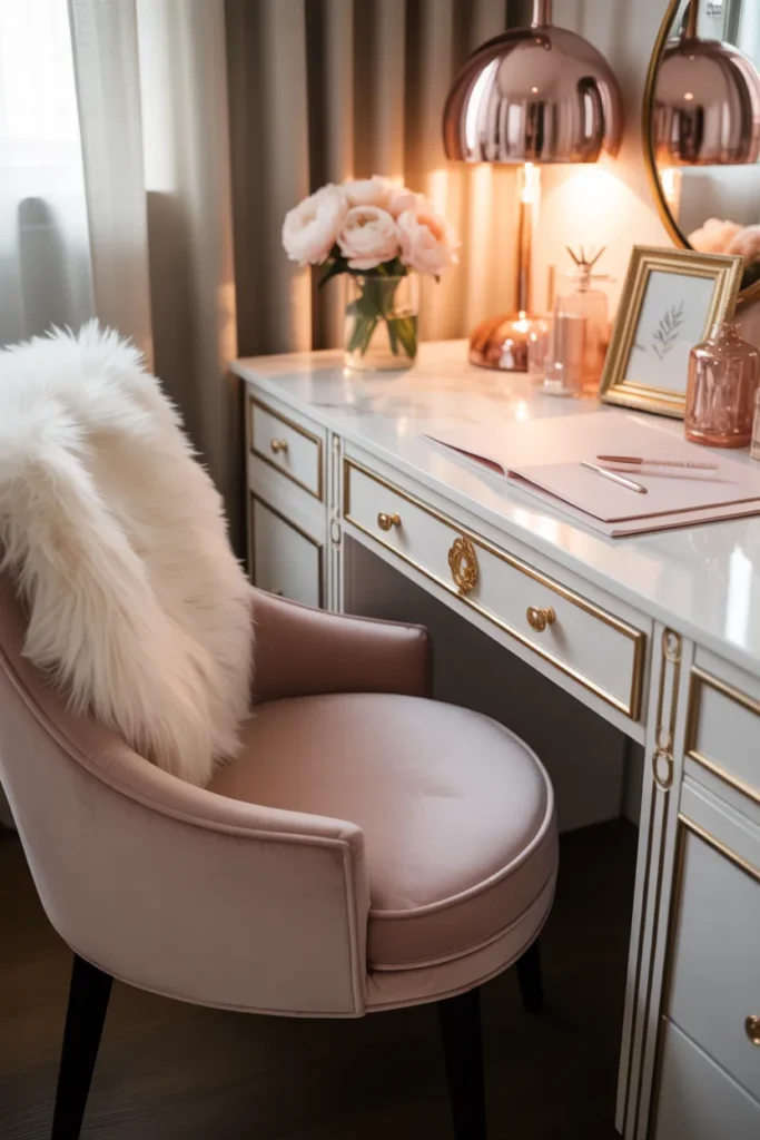 Soft pink tones paired with gold accents can create a workspace that feels warm and slightly luxe without being overwhelming.