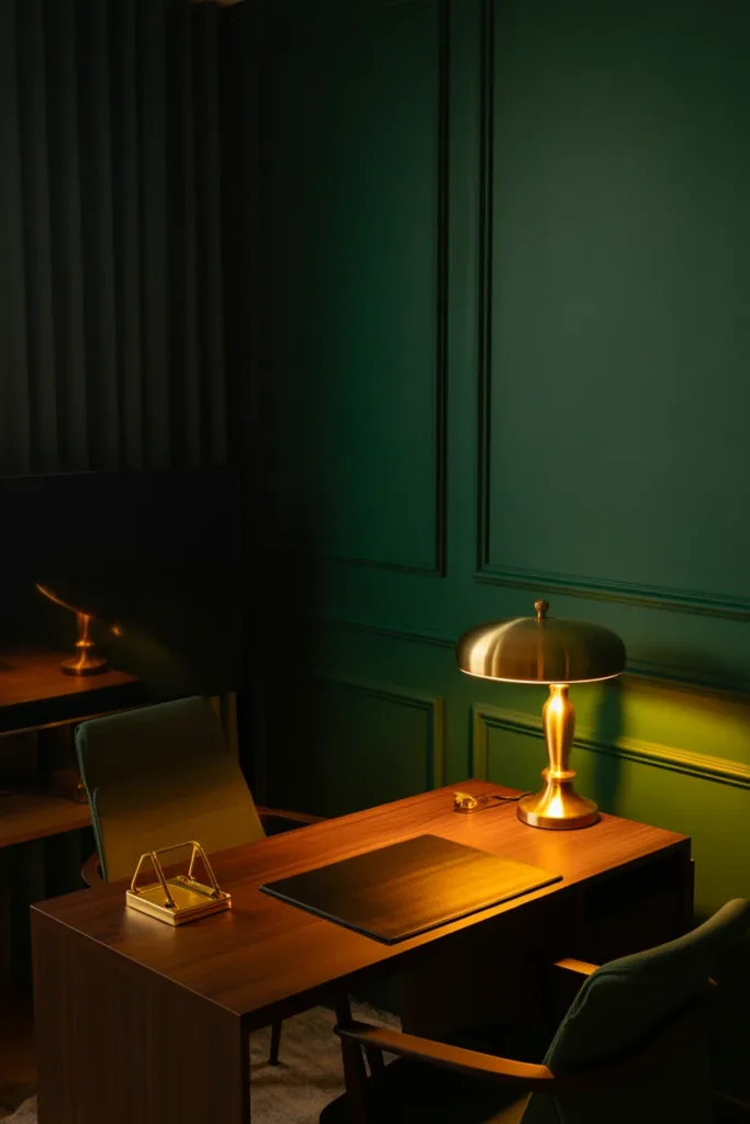 A dark green, charcoal, or even navy wall behind your desk can completely change the energy of your workspace. Pair it with warm lighting like a brass desk lamp to keep it from feeling too heavy.