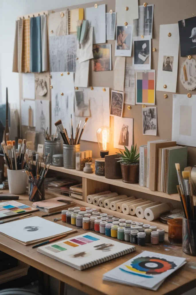 Think mood boards, open shelving with materials, and a desk that feels slightly lived-in rather than perfectly styled.