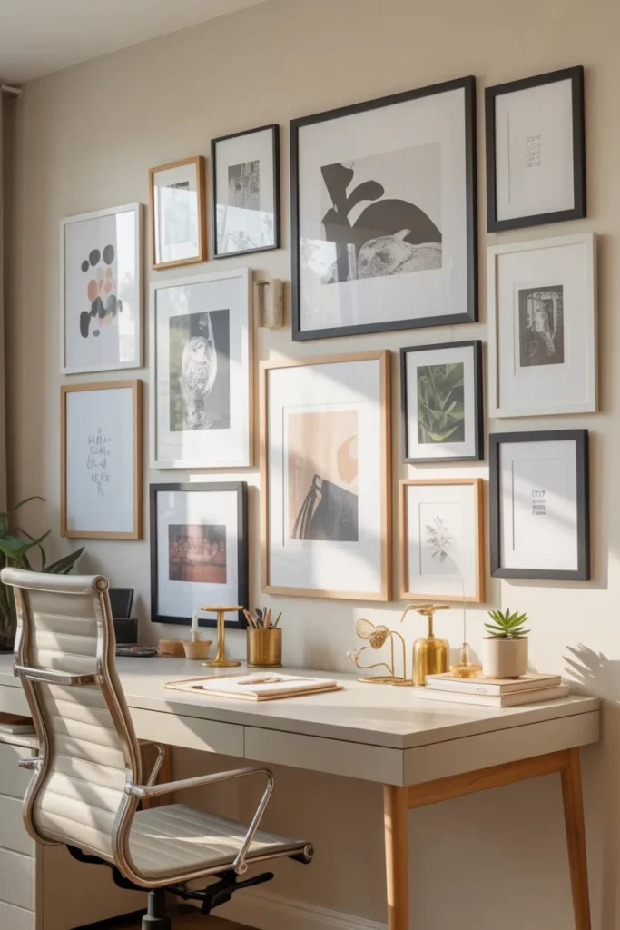 A gallery wall behind your desk filled with art, photos, or prints can make the space feel uniquely yours.