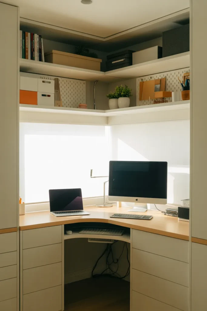 12. Corner Desk Layout That Uses Every Inch Smartly
