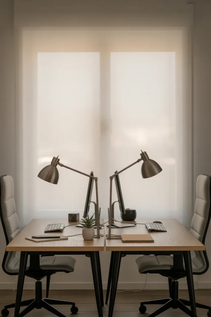 A dual desk setup with symmetry can feel balanced and organized. Think two chairs, two lamps, and mirrored decor.
