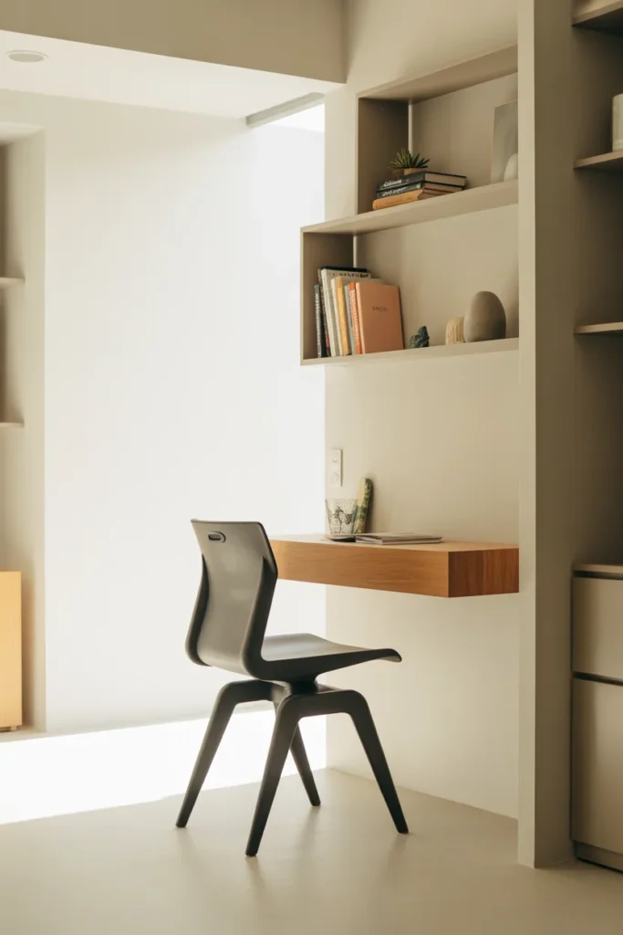 Instead of a bulky desk, a floating shelf mounted at desk height can create a sleek, modern workspace. It feels lighter, cleaner, and surprisingly functional.