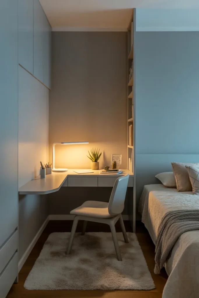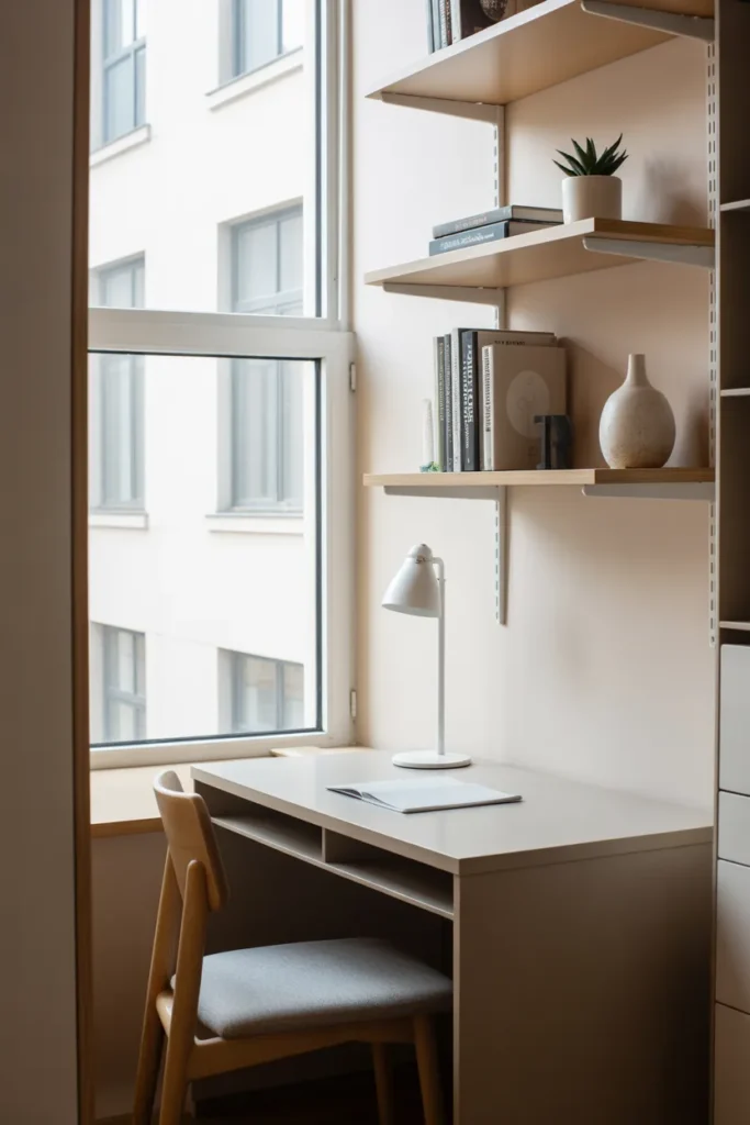 A narrow desk, a wall-mounted shelf, and good lighting can turn even the smallest corner into a productive zone.