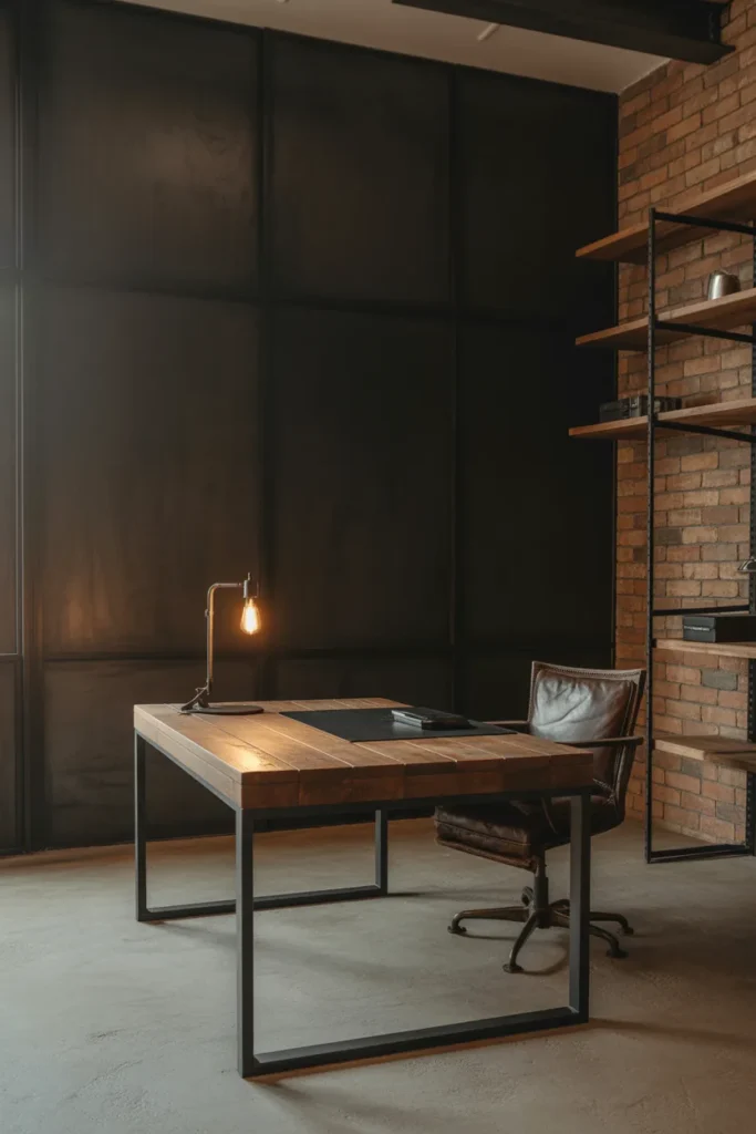 Pair a wooden desk with black metal legs and maybe a brick or textured wall behind.