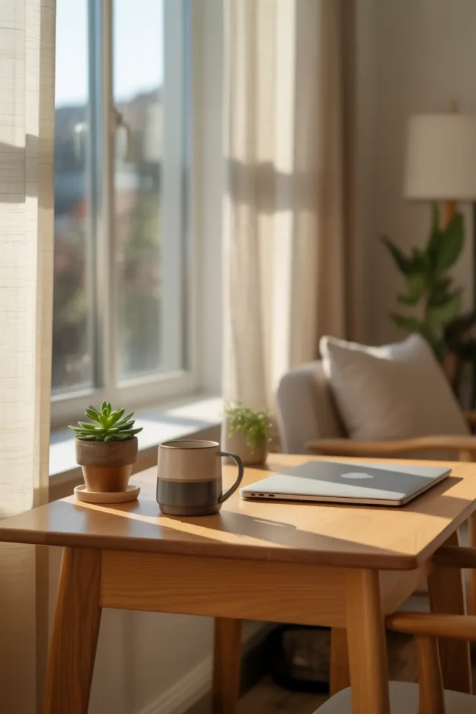 This setup works especially well if you position your desk perpendicular to the window rather than directly facing it. That way, you avoid glare on your screen but still get that soft side lighting. Add sheer curtains so the sunlight diffuses instead of hitting harshly.