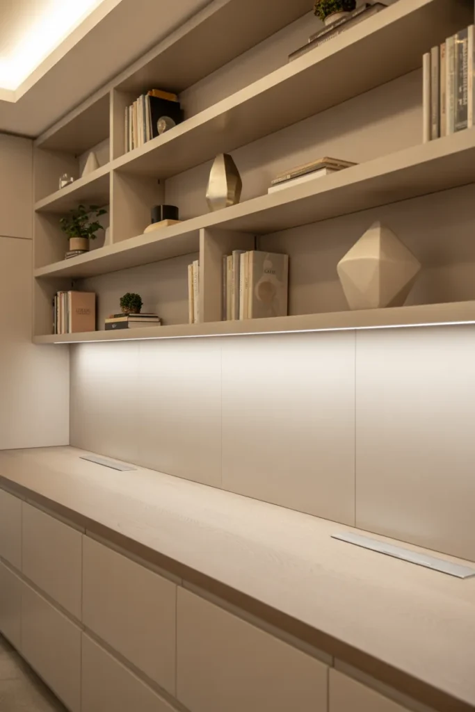 A built-in desk spanning wall-to-wall gives you a seamless, custom look. Even if it’s DIY, it can look high-end with the right finishes.