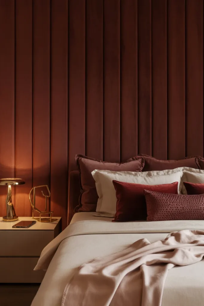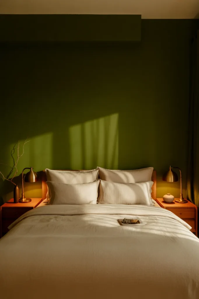 Paint the wall behind your bed in a deep olive shade and keep the rest neutral. Add brass bedside lamps with warm bulbs placed slightly lower than eye level so the light feels intimate, not harsh.