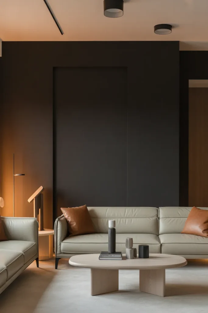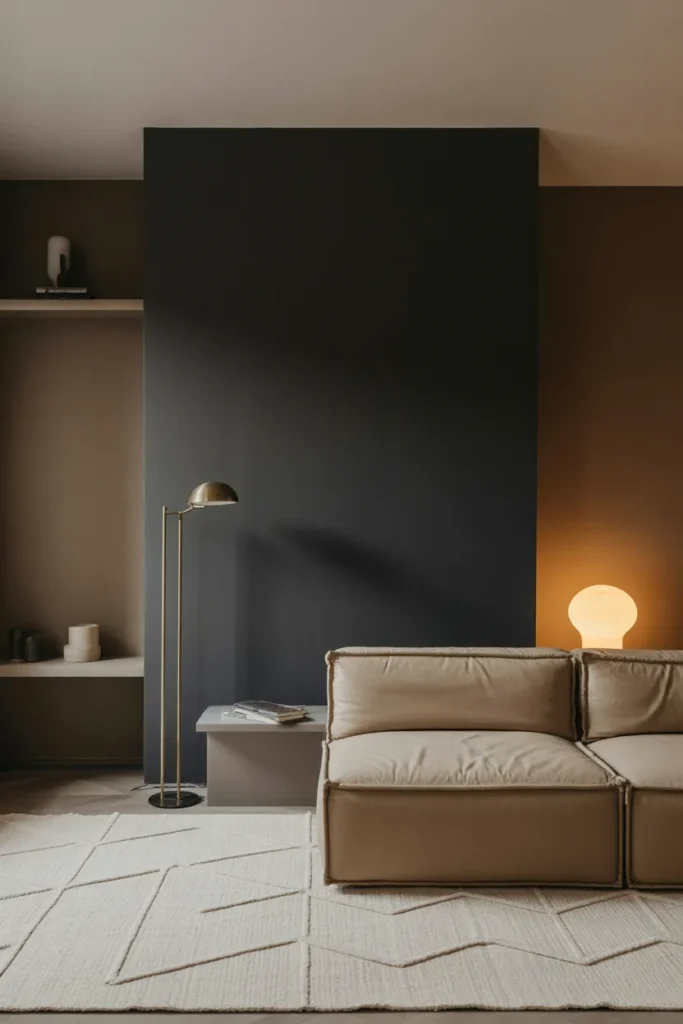 Use charcoal on one feature wall in a living room and offset it with a light rug and neutral sofa placed directly in front. Add layered lighting, a floor lamp in one corner and a table lamp on the opposite side.