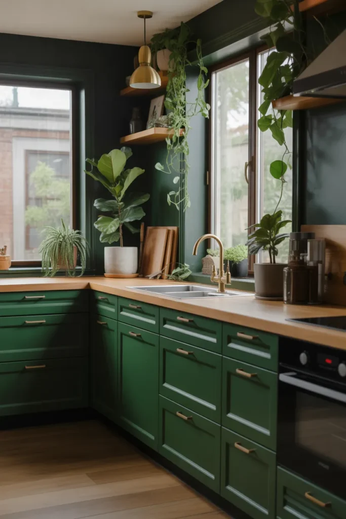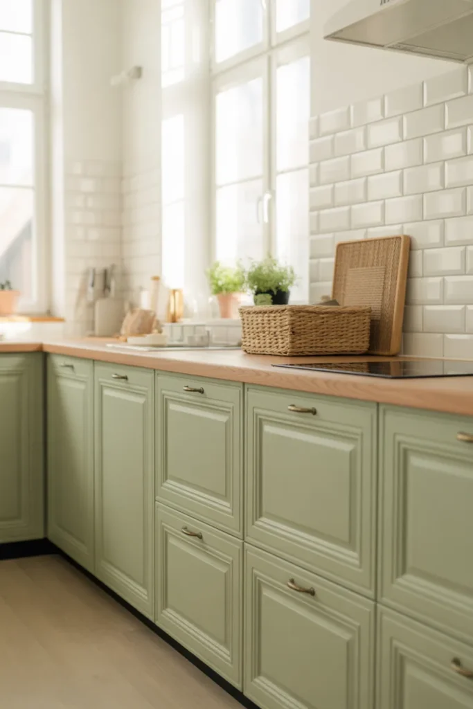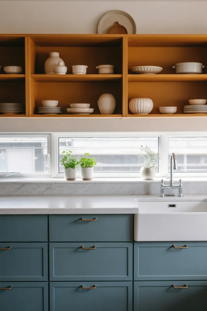 Imagine lower cabinets in dusty blue with a white countertop and open wooden shelves above. Place a small plant near the sink where sunlight hits in the morning, it brings the whole setup to life.