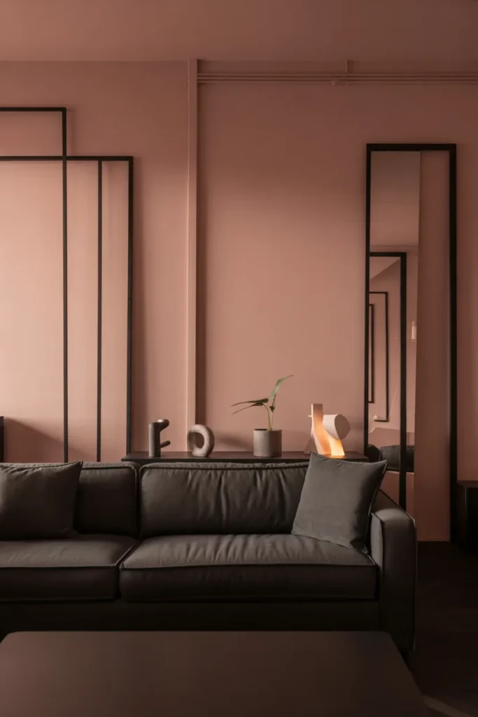 Use blush on walls with darker furniture like a deep brown or muted gray sofa. Add black accents in frames or lighting fixtures to ground the softness.