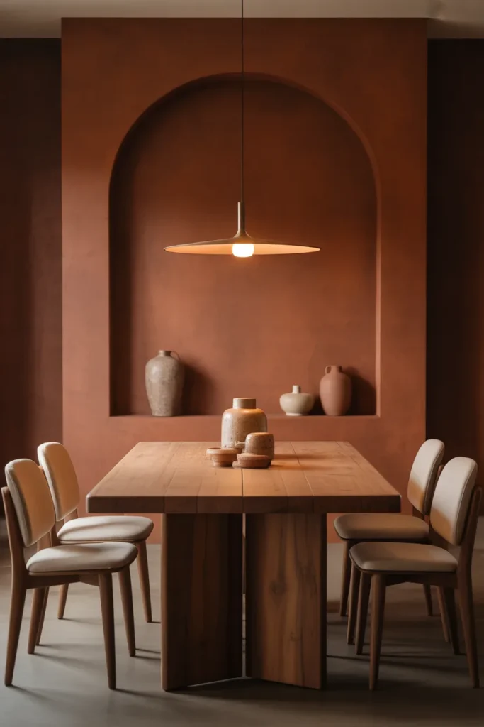 A terracotta accent wall behind a dining table can completely change the mood of your space. Especially if you hang a simple pendant light right above the table, letting the warm tones bounce around in the evening.