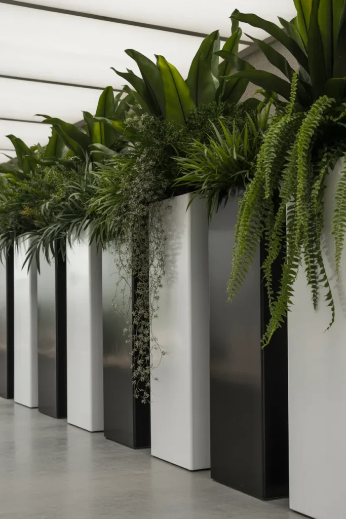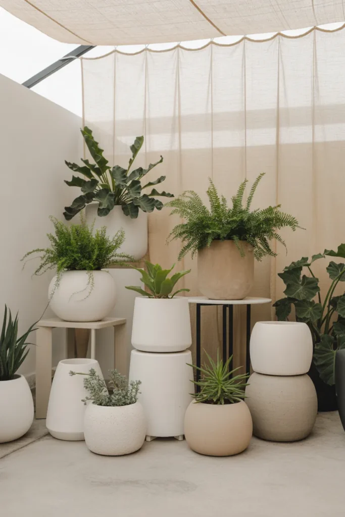 Think white pots, grey planters, and natural wood tones. It creates a calm, cohesive look where the greenery becomes the star.