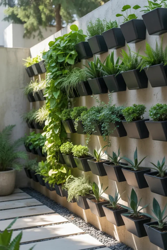 Imagine stepping into your garden and seeing a lush green wall instead of cluttered pots on the ground. The plants climb upward in neat rows, catching soft sunlight and creating a fresh, almost gallery-like vibe.