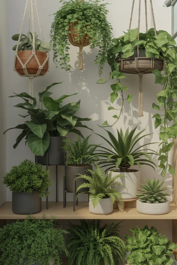 Use stands, shelves, and hanging planters to build layers. It draws the eye upward and makes your space feel fuller without overcrowding.