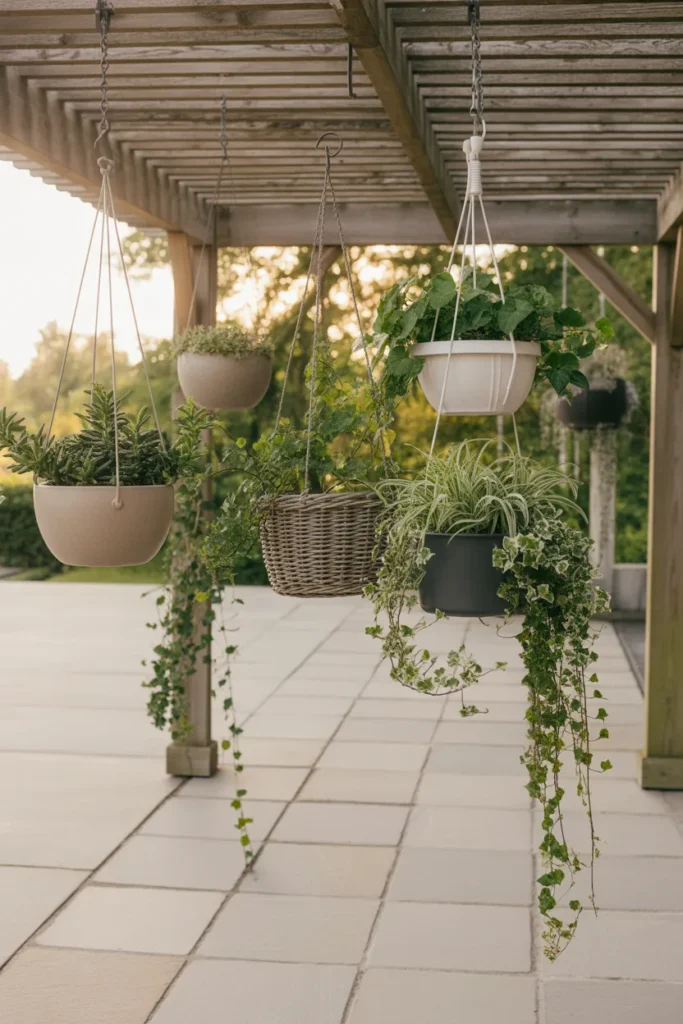 If your ground space is already packed, look up. Hanging planters create a floating garden effect that feels light and uncluttered.