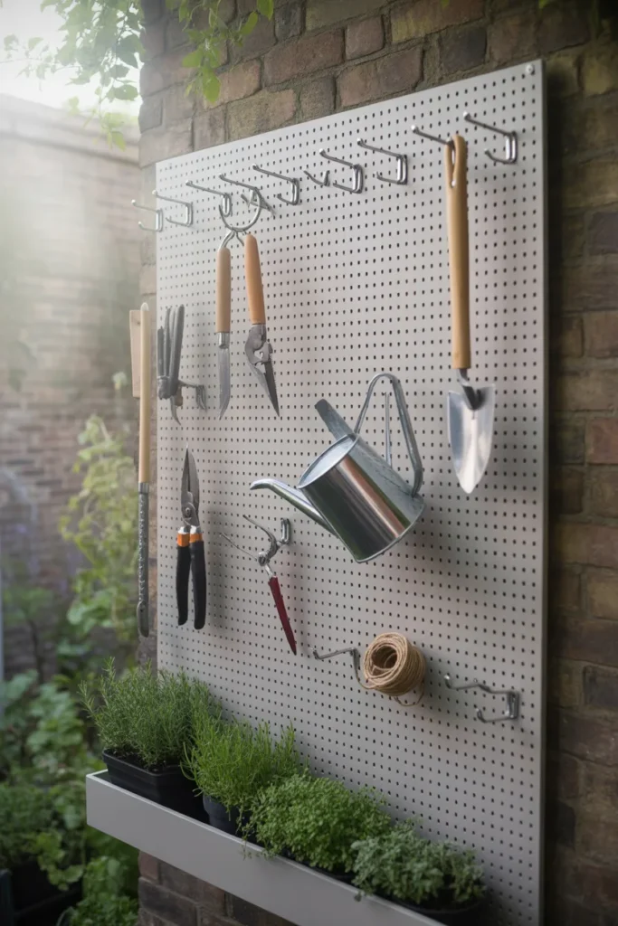 Use simple hooks or a pegboard system. It’s practical, but also adds that organized, workshop-like aesthetic.