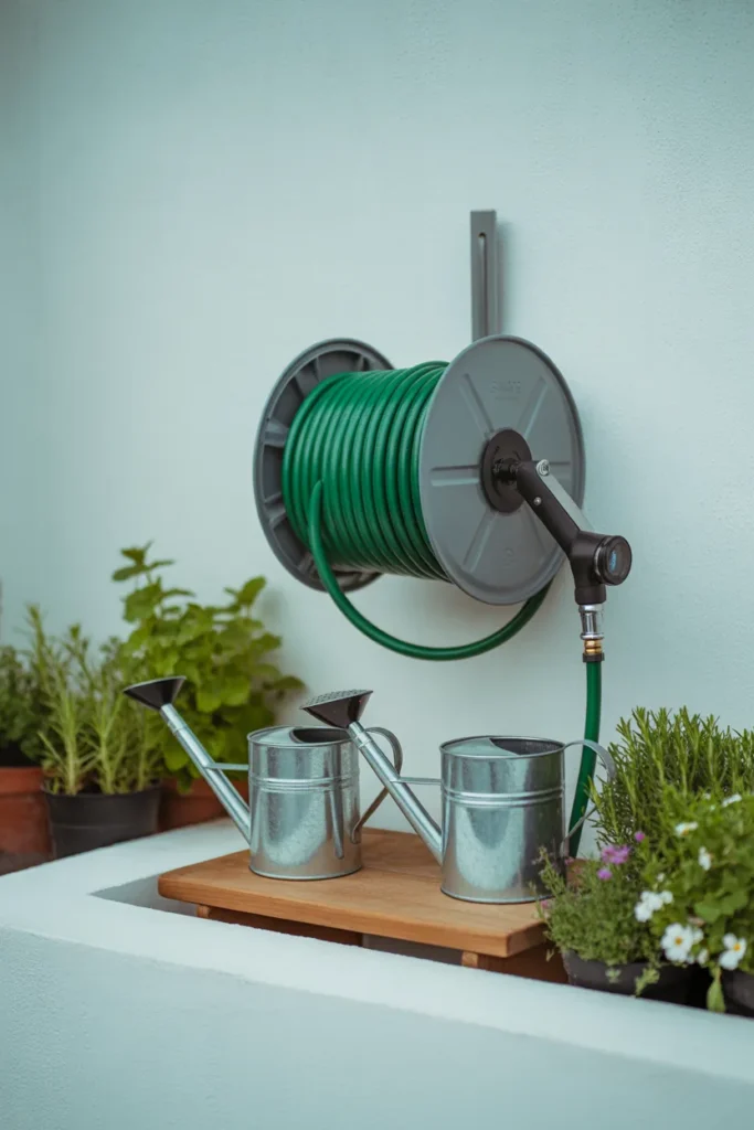 A small watering station with a hose reel or watering cans placed neatly in one spot keeps things simple. Position it near your main plant area to cut down on effort.