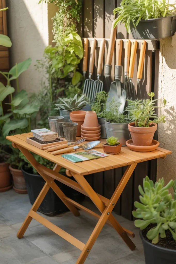 Picture a compact potting bench tucked into a corner, sunlight falling right across the surface as you repot your plants. No mess, no digging around for tools.