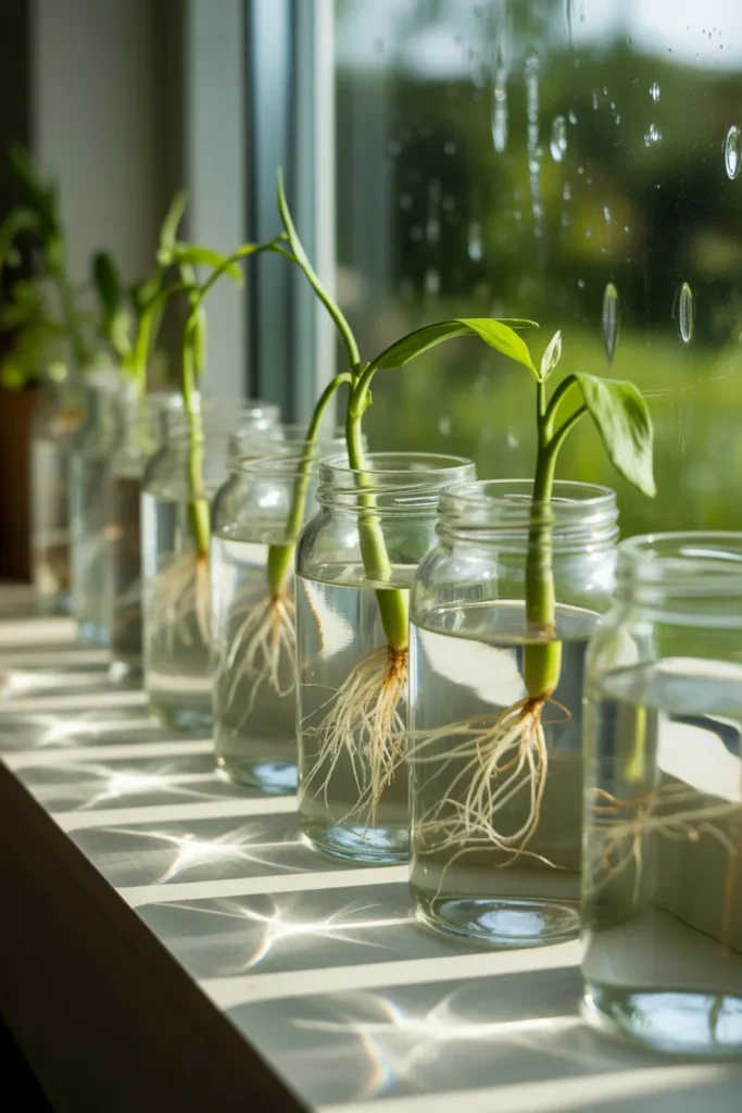 You know those tiny cuttings sitting in random cups? Swap them for clear glass jars and suddenly everything looks intentional.